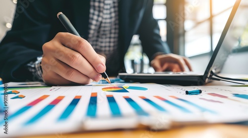 Close up of businessman's hand writing on a graph while working on a laptop.
