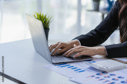 Close up of businesswoman hand holding pen and pointing at financial document Financial charts to analyze with documents on the table planning financial report business plan profit investment concept