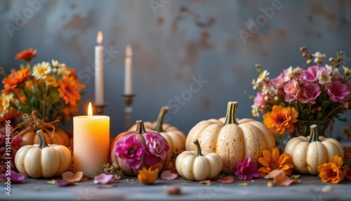 close up of candles, pumpkins, and flowers in a selective focus position, subject at the bottom with ample copy space at the top, optimized for photo use.