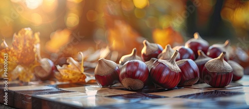 Close up of chestnuts on a chessboard Autumn atmosphere Blurred background Lovely autumn image Space for text. Copy space image. Place for adding text and design