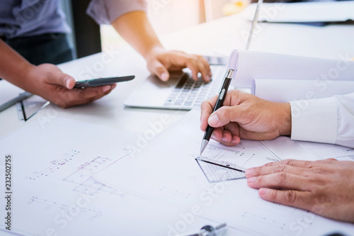 Close up of civil male engineer asian working on blueprint architectural project at construction site at desk in office.