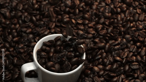 Close up of coffee bean falling in to coffee cup surrounded by pile of beans. Dropping aromatic blending bean in to white cup. Top view of coffee drop in to glass with black background. Comestible.