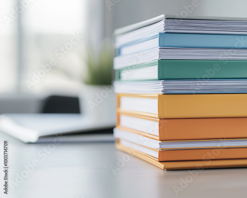 Close up of color coded files and folders stacked neatly on desk, showcasing vibrant organization system. arrangement adds cheerful touch to workspace