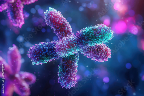 Close up of colorful antibody structure interacting with virus, showcasing intricate details and vibrant colors in microscopic view. image captures beauty of molecular biology