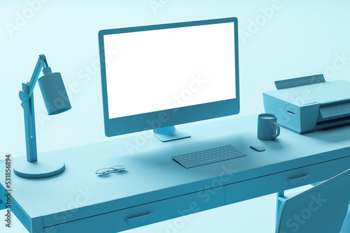 Close up of creative blue minimalistic designer workspace with furniture, empty mock up computer monitor and other items. 3D Rendering.
