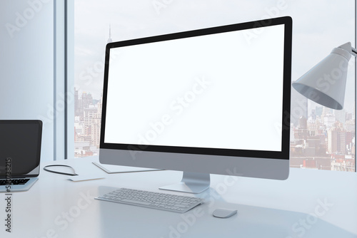 Close up of creative designer desktop with empty white mock up computer monitor laptop and supplies in modern office with window and panoramic city view. 3D Rendering.