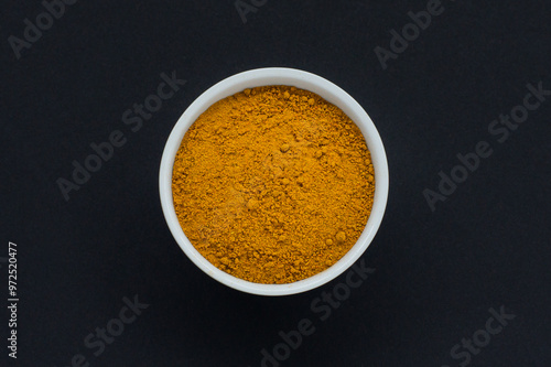 Close up of curry powder in a white bowl on a black background