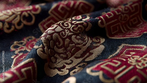 Close up of dark richly textured fabric featuring a gold geometric pattern with red outlines in traditional Chinese motifs and patterns. Highly detailed embroidery or raised jacquard weave