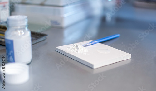 Close up of dental spatula and cement for fillings on desk in dental office.
