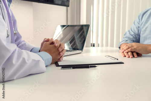 Close up of doctor filling up an history form while consulting patient and recommend treatment methods and how to rehabilitate the body