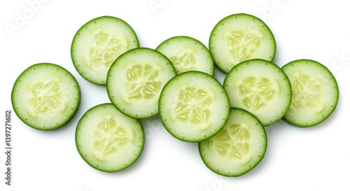 Close up of fresh cucumber slices arranged on a white background in a delicious overlapping pattern