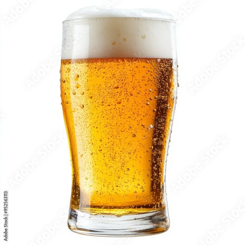 close up of Glass of cold beer with foam, bubbles in drink isolated on white background