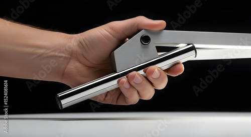 Close up of hand holding a silver metal lamp with a black background and white surface