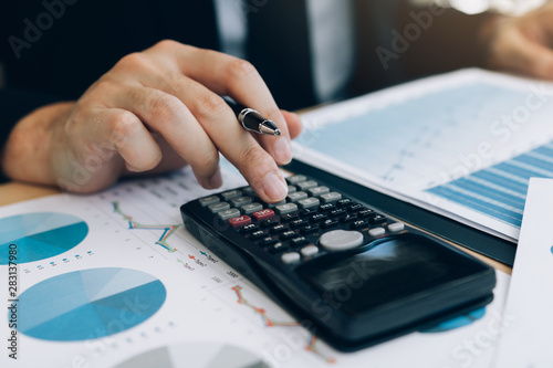 Close up of hand investors are using calculators to calculate the company's earnings to invest in stocks for future profits.