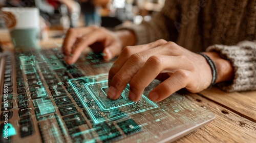 Close up of hands typing on a laptop keyboard with a futuristic, teal digital overlay. Wooden table background.