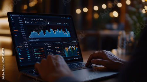Close Up of Hands Typing on Laptop with Financial Data Displayed