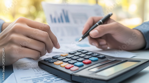Close up of Hands Using Calculator and Reviewing Financial Documents and Charts