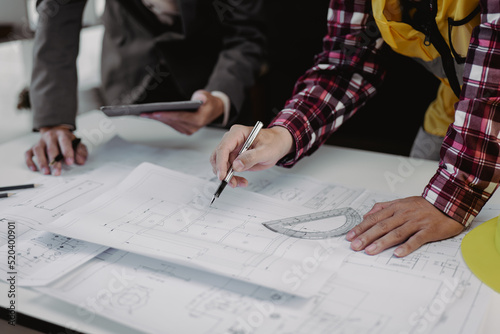 Close up of hands working and brainstorming on paperworks and floor plan drawings about design architectural and engineering for houses and buildings.