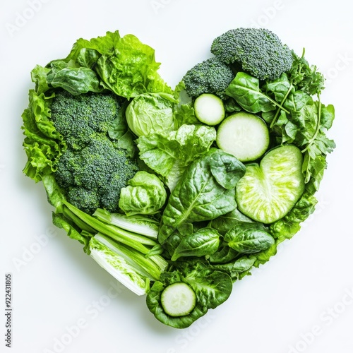 Close up of Heart shape green vegetables, Green healthy vegetables in the shape of a heart on an isolated white background