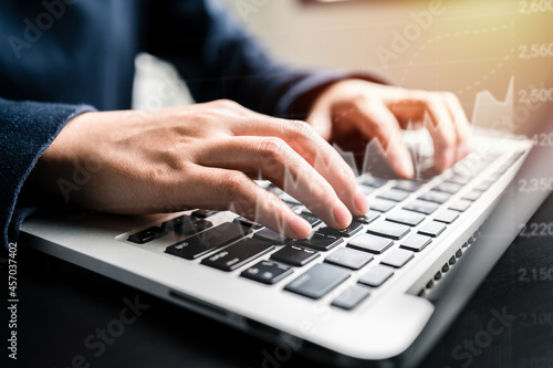 close up of investor women typing keyboard laptop computer with analyzed stock market with forex graph, online digital finance technology, economic growth chart trend, financial and investment concept