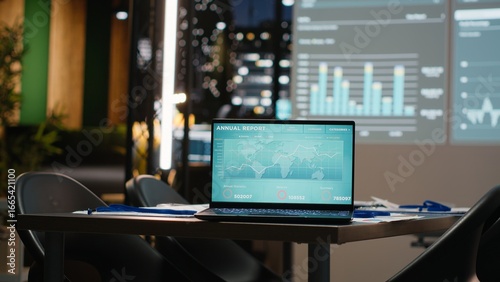 Close up of laptop in empty corporate office after hours, projected charts and analytics ready for project briefings and strategic meetings within a success focused organization.