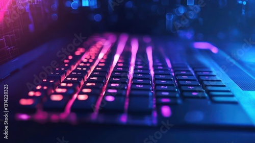 Close Up Of Laptop Keyboard With Blue And Pink LED Lights Illuminating In Dark Background