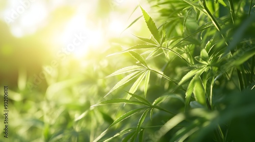 Close up of Lush Green Hemp Leaves Swaying Gently in a Sunny Countryside Field with Ample Copy Space at the Top for Text