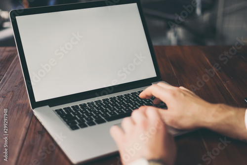 Close up of male hands and laptop with blank screen. Mock-up of computer monitor. Copyspace ready for design or text