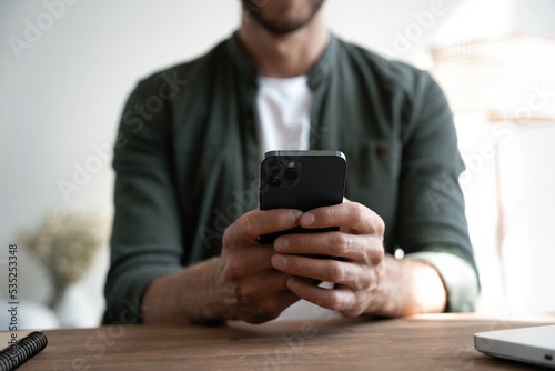 Close up of male hands with mobile. Man pointing on smartphone screen, chatting in social networks