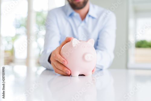 Close up of man hands holding piggy bank