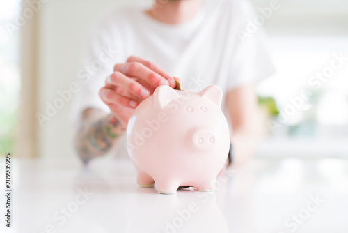 Close up of man putting a coin inside piggy bank as savings