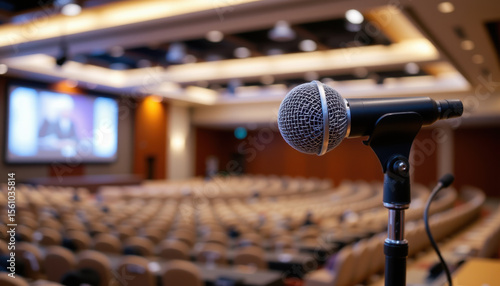 Close up of microphone in large conference hall, showcasing empty seating arrangement and screen in background. atmosphere suggests anticipation for upcoming event