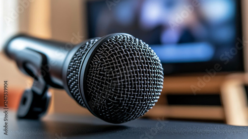 close up of microphone on table with blurred background, capturing details of microphone mesh and structure
