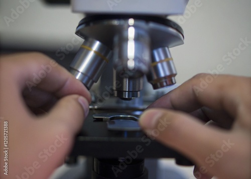 Close up of microscope in laboratory. Scientific research and development concept.