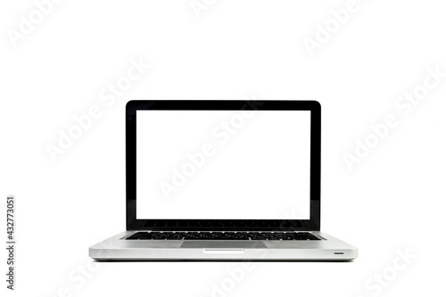Close up of Mockup Laptop blank(empty) white screen isolated on white background view. Business office. Technology latop.