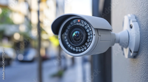 Close up of modern surveillance camera mounted on wall, capturing urban security