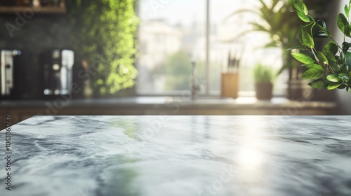 Close up of Modern white marble kitchen table empty for display on bright luxury room background. Ai generated image