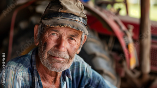 Close up of old American farmer wearing a worn baseball cap sitting in front of his farming heavy machinery while looking at the camera.