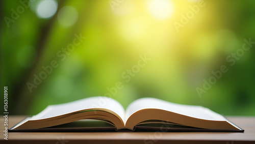Close Up of Open Book in Home Garden with Nature Bokeh Background - Perfect for Showcasing Reading and Peaceful Outdoor Study Environment in Photo Stock