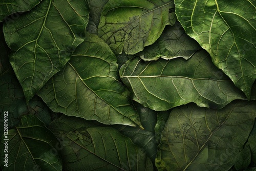 Close up of overlapping dark green leaves forming a textured natural background, ideal for nature themed projects