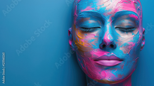 close up of painted face with vibrant colors against blue background, showcasing artistic expression and creativity. serene expression adds to visual impact