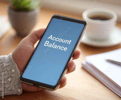Close up of person holding smartphone displaying account balance, showcasing financial management and technology use in daily life. cozy setting adds warmth