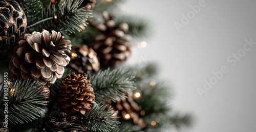 Close up of pine cones and Christmas lights on a tree branch