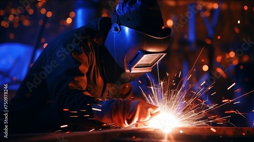 Close up of professional welder working on medium sized pipe with blue light in foreground