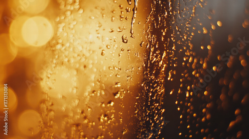 Close up of raindrops on window, creating warm, golden atmosphere during storm. droplets reflect light beautifully, enhancing cozy feeling of scene
