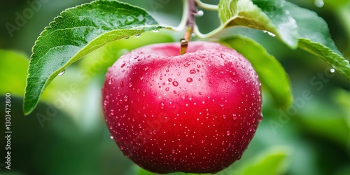 close up of red apple with water drops, bokeh background, detailed texture and close-up view of the fruit surface