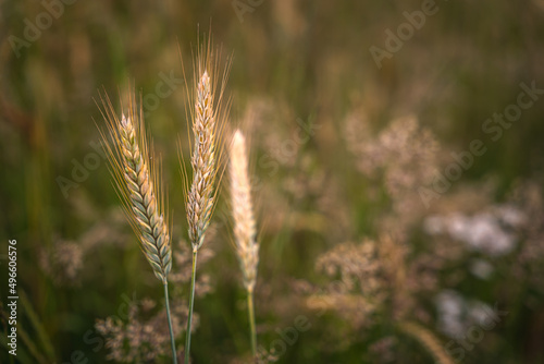 Close up of ripe grain. wheat field. Landscape of golden ripe wheat under sunlight. Rich harvest. Agriculture Bavaria Germany.
