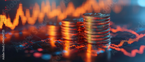 Close up of stack of coins with financial graph data in the background, symbolizing investment growth and market trends.