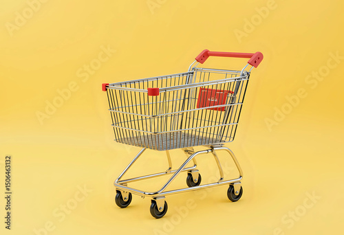 Close up of supermarket grocery push cart for shopping with black wheels and red plastic elements on handle isolated on yellow background. Concept of shopping.