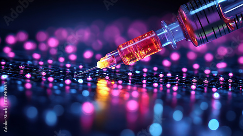 close up of syringe with colorful liquid, symbolizing modern medicine and technology. vibrant background enhances futuristic feel of medical applications